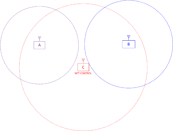 There are two important technical issues that should be considered when convening a simplex net. The first is called the hidden transmitter problem. The following illustration shows the coverage area of three stations operating in a simplex net. Stations A and B are both situated within the coverage area of the net control, Station C. However, A and B cannot hear each other. If Station B comes up on frequency while Station A is sending traffic to net control, Station B may assume the frequency is clear and place a call to Net Control, thus interfering with Station A’s ongoing transmission. That’s one common manifestation of the hidden transmitter problem.
